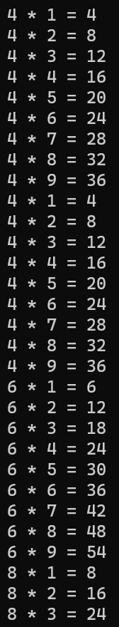 구구단을 짝수단만 출력하는 for문을 작성하시오.
