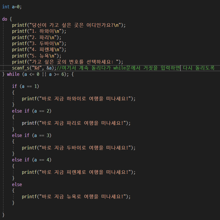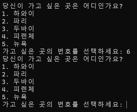 만약 여행지 목록에 없는 번호를 선택하였다면, 목록에 있는 여행지를 선택할 때까지 여행지 목록을 다시 보여주도록 하시오.