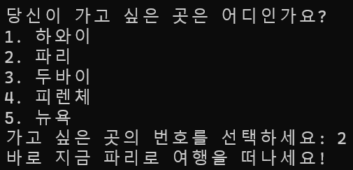 여행지 목록을 보여주고, 목록 번호를 선택하면 그 여행지를 출력하는 프로그램을 작성하시오