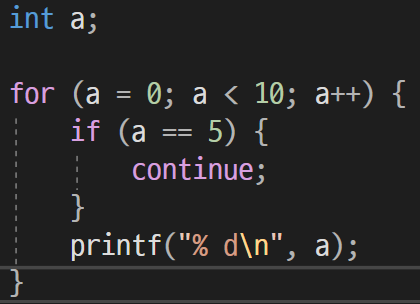 continue구문에 해당하는 부분만 실행이 안 될 뿐이지 반복문 자체를 중단하는 것이 아니므로 5를 제외한 다음 숫자부터는 다시 반복하여 실행한다.
