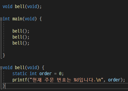 그 뒤 bell()함수가 실행되고 bell()함수에서 orde라는 정수형 변수를 선언한 뒤 값을 0으로 초기화하면서 int 앞에 static이라는 키워드를 넣었다.