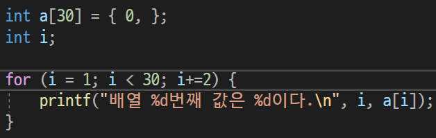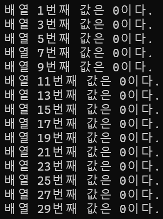 배열 크기가 30인 정수형 배열 a를 선언한 후 모두 0으로 초기화하고 홀수 번째 배열 요소만 출력하는 프로그램을 작성하시오.