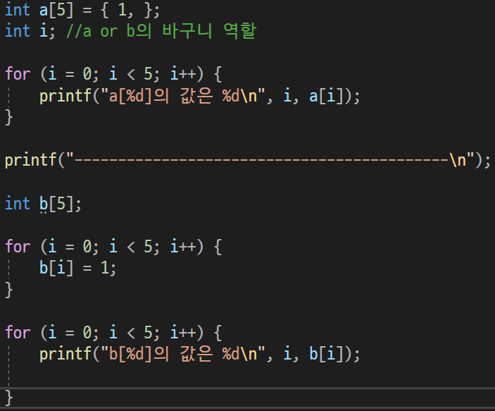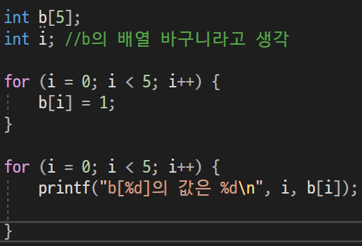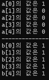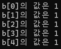 배열 크기 5인 정수형 배열 b를 선언하고 모두 1로 초기화하려고 한다.