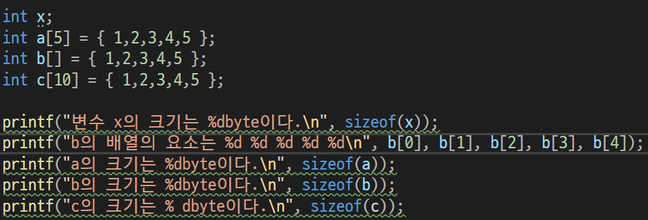 5개의 정수를 저장하는 데 배열c와 같이 배열 크기를 10개로 설정하는 것은 메모리 낭비이다.