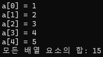 크기가 5인 정수형 배열 변수 a를 선언하여 정수 5개를 저장할 메모리 공간을 할당받는다.