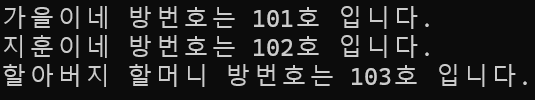 ex)가을이네 방 번호가 101호 이라는 것을 family[0]에 저장하려면 family[0]=101;처럼 대입연산자를 사용하면 된다.
