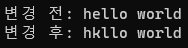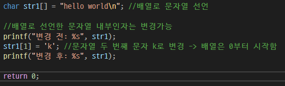 단, "hello world" 전체는 상수형으로 할당되었기 때문에 임의로 배열을 변경할 수 없다.