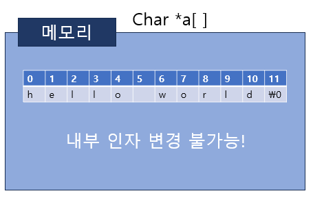 즉, 상수는 변할 수 없는 값이므로 *a= 'k' 이런 식으로 포인터 값을 변경할 수 없다.