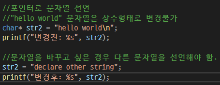 포인터로 선언하고 변경을 원할 시, 다른 문자열 주소를 넣어주어야 한다.