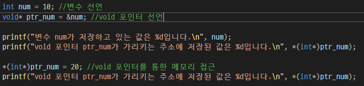 또한, void포인터를 통해 메모리를 접근하기 위해 명시적 형 변환을 하는 방식 *(데이터 타입*)변수 이름