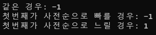 두 문자열이 같은 경우 0, 첫 번째 문자열이 사전순으로 빠를 경우 -1, 느릴 경우 1을 반복한다.