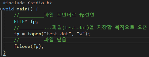 쓰기 모드로 "test.dat"파일을 열고 다시 닫는 예