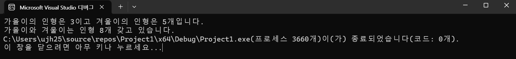 출력: 가을이의 인형은 3개이고 겨울이의 인형은 5개입니다.