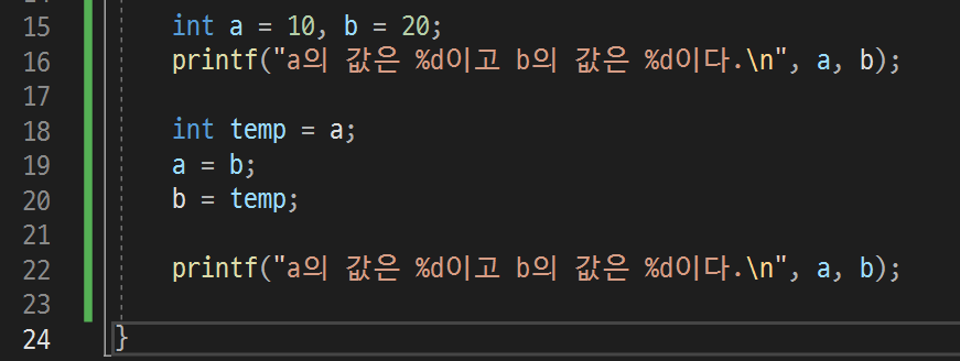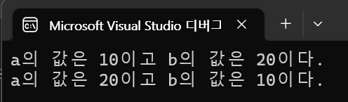 각 변수의 값을 출력한다. 그 다음 변수 a, b의 값을 서로 교환해서 저장하고 다시 변수의 값을 출력하는 프로그램을 작성하시오.