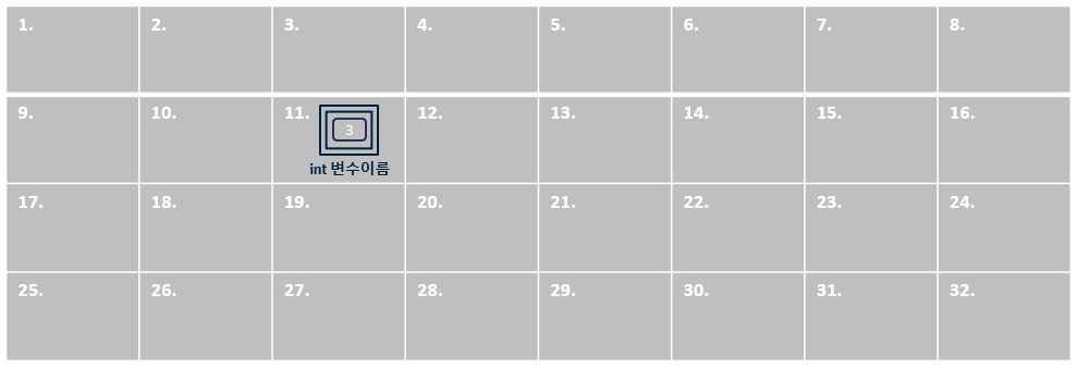그래서 의미없는 번지수 대신 사람이 외우기 쉬운 “변수명”이라는 것을 해당 주소에 붙여서 사람은 변수명만 외우면 컴퓨터가 알아서 변수명과 매칭된 주소에 있는 데이터를 꺼내주는 식으로 작동하게 된다.