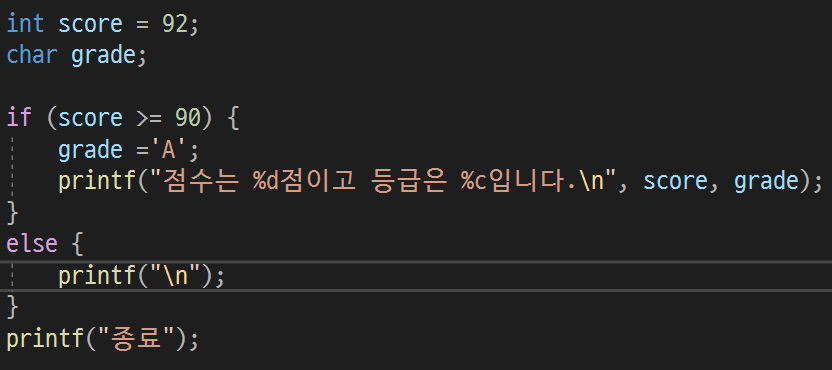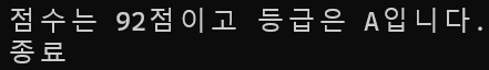 정수형 변수 score에 92를 할당한 후 문자형 변수 grade를 선언한다. 점수가 90보다 크거나 같다면 '점수는 92점이고 등급은 A입니다.'를 출력한 후 '작업종료'를 출력하도록 프로그램을 작성하시오.
