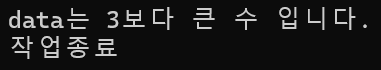 정수형 변수 data에 5를 할당한 후 data가 3보다 크면 "data는 3보다 큰 수입니다."를 출력한 후 "작업종료를 출력하도록 프프로그램을 작성하시오.