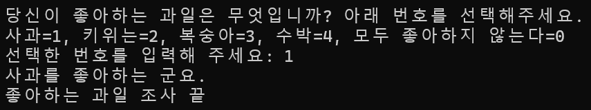 6. 조건문이 끝나면 "좋아하는 과일 조사 끝" 문장 출력