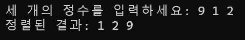 사용자로부터 정수 3개를 입력받아, 오름차순으로 정렬하여 출력하는 프로그램을 작성하시오.