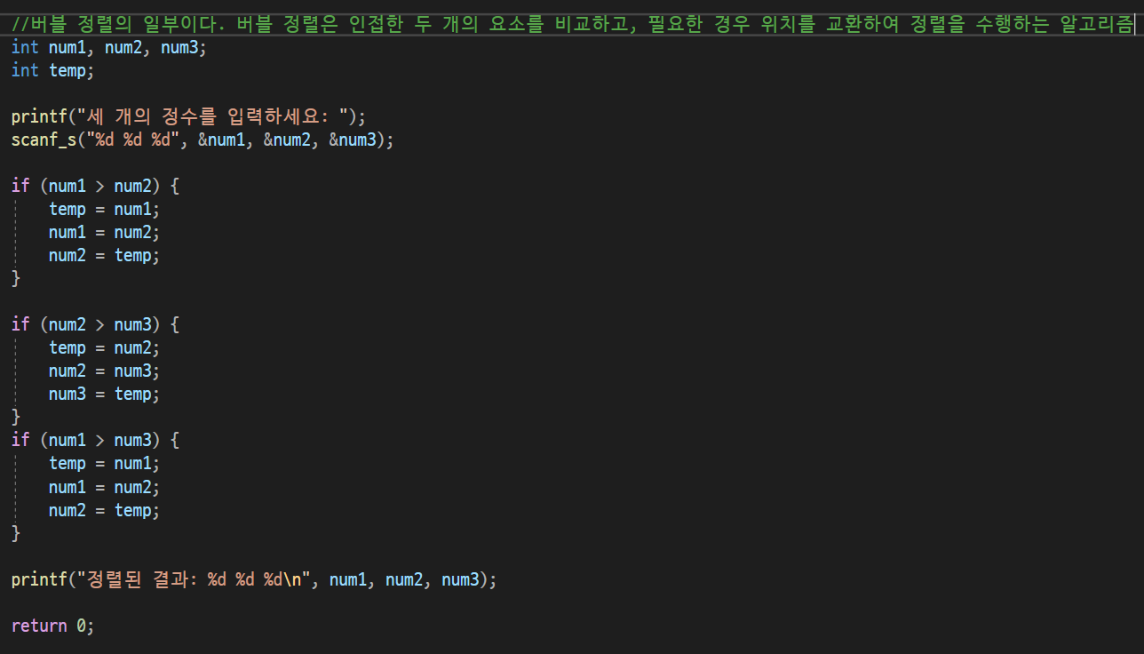 마지막으로, 세 번째 if문에서 num1과 num2를 다시 비교하여 num1이 더 크다면 두 값을 교환한다. num1에는 가장 작은 값이, num2에는 중간 값이 저장된다.