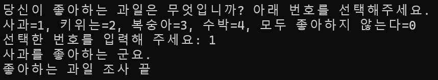 6. 조건문이 끝나면 "좋아하는 과일 조사 끝" 문장 출력