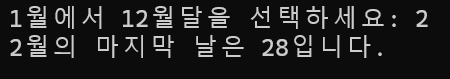 이렇듯 매월 마지막 날짜가 다릅니다. 1월에서 12월 중에 월에 해당하는 숫자를 입력받으면 해당하는 월의 마지막 날의 출력하는 프로그램을 작성하세요.