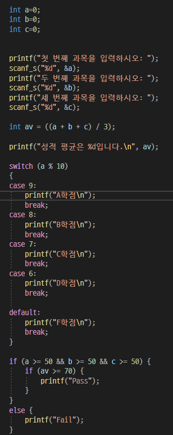 세 과목에 대한 점수를 입력받아 평균을 구하고 90점 이상이면 A학점 90점미만 80점이상이면 B학점, 80점미만 70이상이면 C학점, 70점미만 60점이상이면 D학점, 60점미만이면 F학점을 출력하는 코드를 작성하시오.