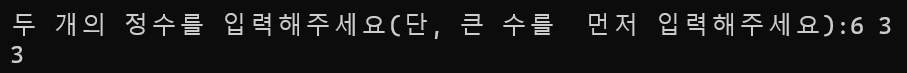두 개의 정수를 입력해주세요.(단, 큰 수를 먼저 입력해주세요): 6 3