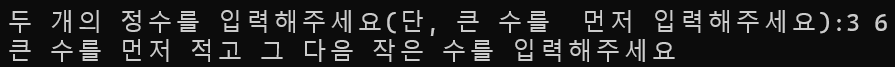 2. 작은 수를 먼저 입력한 결과 '큰 수 를 먼저 적고 그 다음 작은 수를 입력새주세요'를 출력한다.
