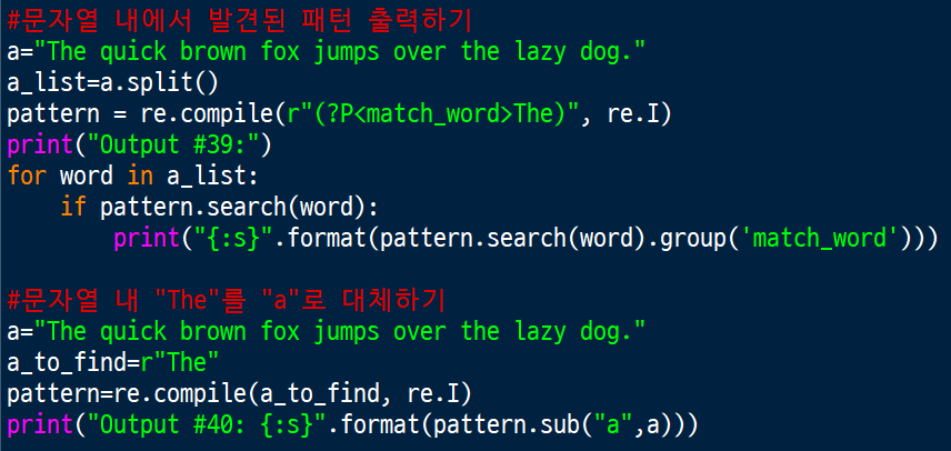 그 다음 새로운 코드는 마지막 줄에 있다. re.sub함수로 변수 a내에서 "the"패넡을 대/소문자 에 상관없이 찾고, 이 패턴이 등장한 것들을 소문자 'a'로 교체하기 위해 re.sub함수를 이용한다.
