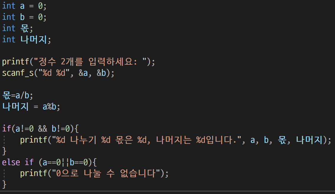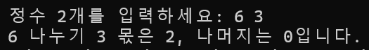 정수 2개를 입력받고 나눈 몫과 나머지를 출력하는 프로그램을 작성하시오.