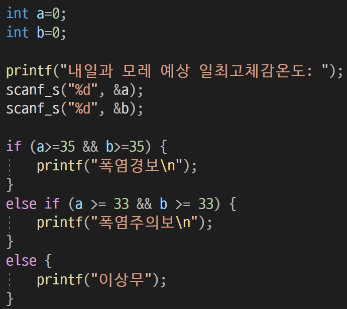 내일과 모레의 일최고체감온도를 입력하고, 입력받은 값에 따라 다른 경고를 출력하는 프로그램을 작성하시오.
